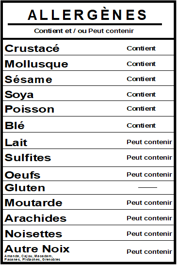 INGRÉDIENTS : Pâte : Amidon de blé, Amidon de tapioca modifié, Gras de porc, Sel, Eau Farce : Crevette, Gras de porc, Pousse de bamboo, Sucre, Amidon de tapioca modifié, Huile de sésame, Sauce soya (eau, blé, soya, benzoate de sodium, aspergillus sojae), Sel, Glutamate monosodique, Épices